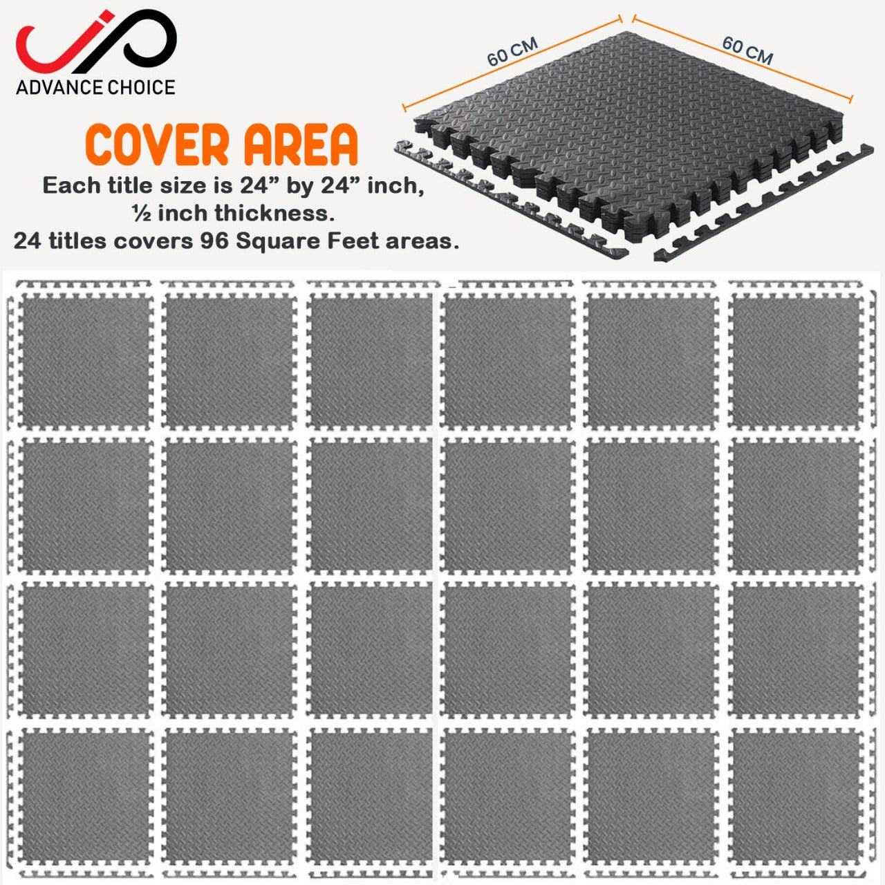 COVER AREA – Each title size is 24” by 24” inch, ½ inch thickness. 24 titles covers 96 Sq. Ft areas.