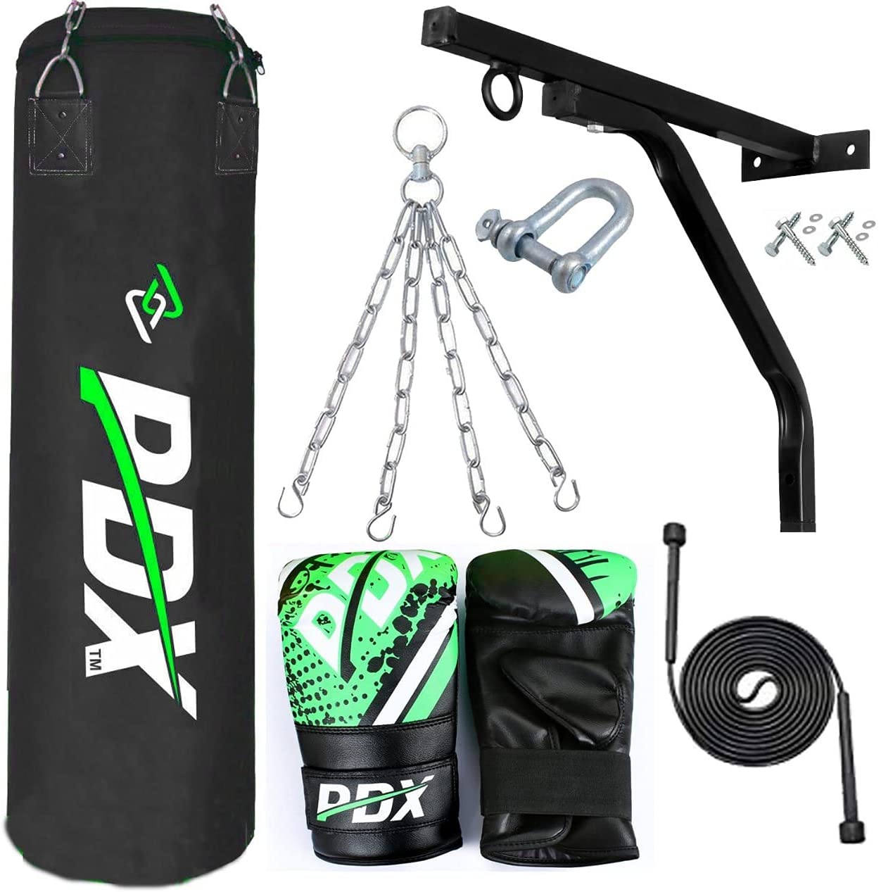 PDX Black/Green 4 Feet UNFILLED Punching Bag Set (7Pcs)